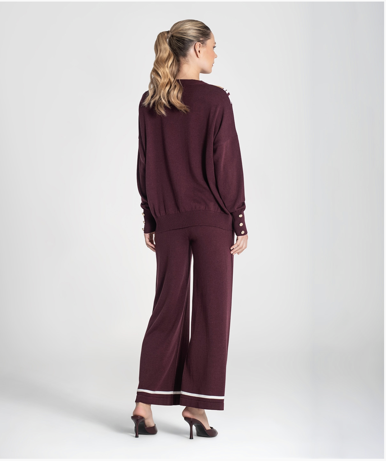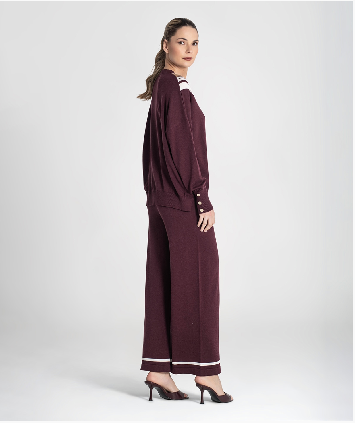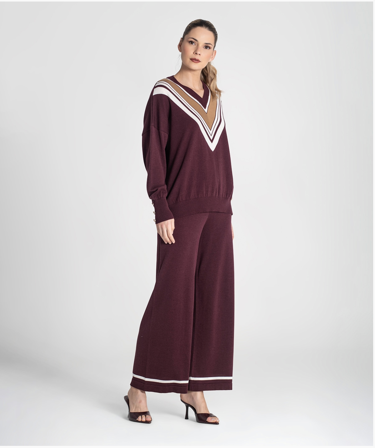 V-neck sweater with contoured stripes.